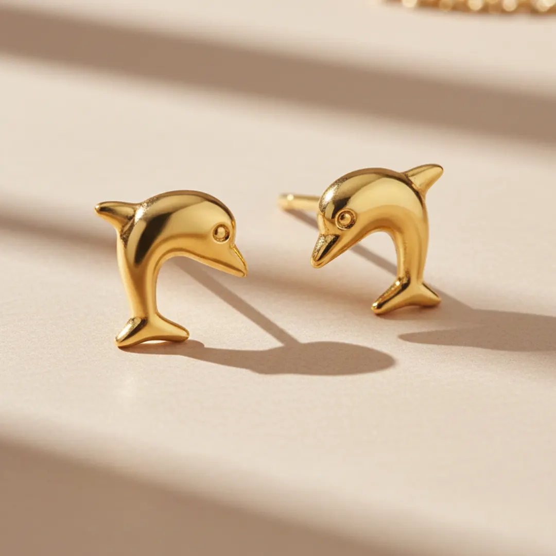 14K gold dolphin-shaped stud with a smooth, plain finish. A playful and elegant choice for ocean lovers.