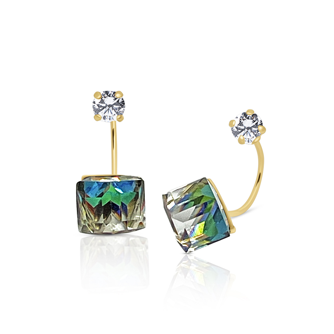 A vibrant 14K gold large vitral cube stud, radiating colorful brilliance. Perfect for bold, artistic expression!