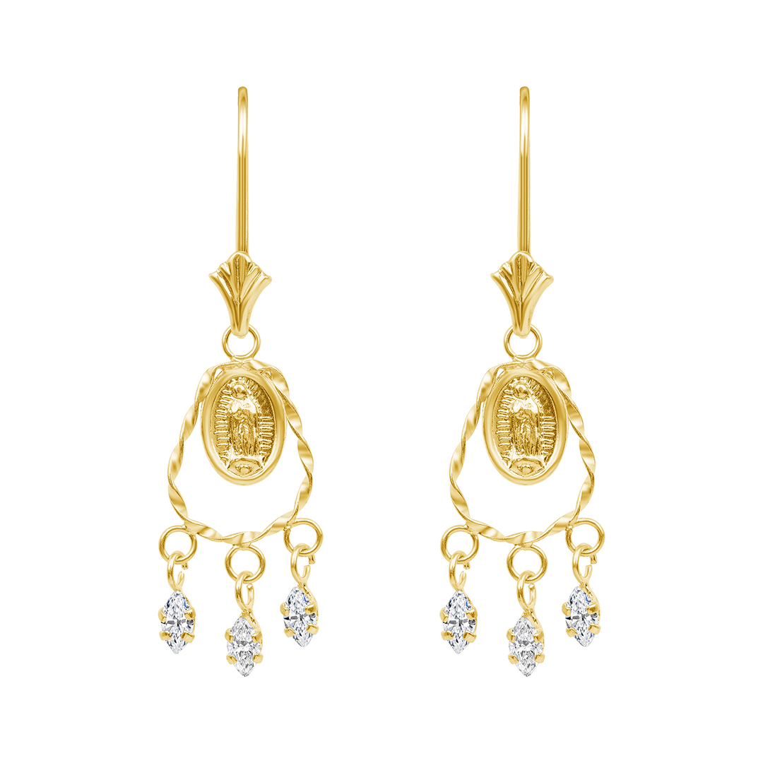 A delicate 14K gold wire chandelier stud with a small Guadalupe dangle, exuding spiritual grace. Perfect for faithful, stylish hearts!